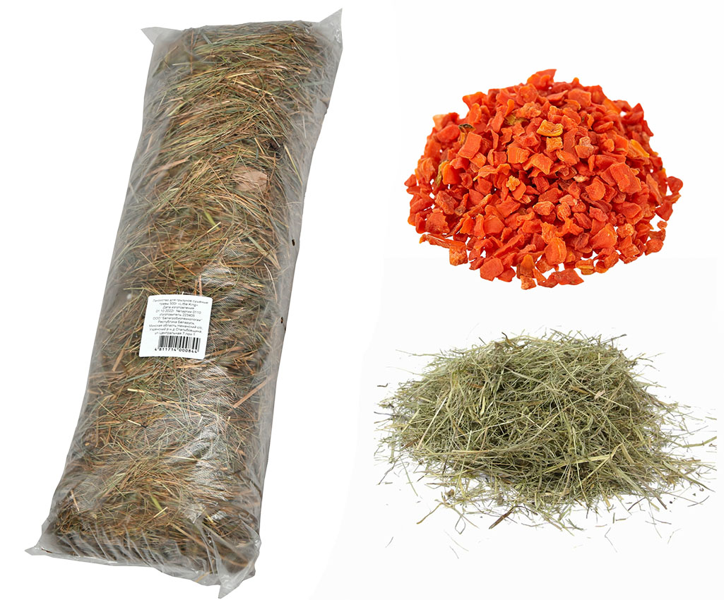 Сено является натуральным источником клетчатки, необходимой для нормального пищеварения грызунов. Морковь обогащает рацион витамином А и другими полезными микроэлементами.