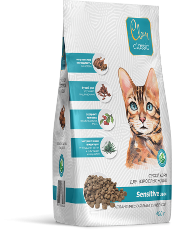 Функциональный сухой корм премиум качества Clan — это идеальное питание для вашей кошки по доступной цене. Корм изготовлен из высококачественного дегидрированного мясного и рыбного сырья. Натуральный состав: без искусственных консервантов и ароматизаторов. Идеальное соотношение цена/качество. Содержание мясных ингредиентов — не менее 37%.
