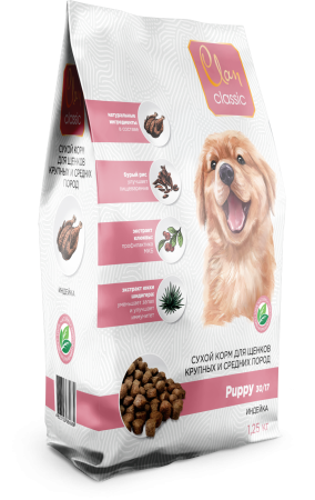 Высокое содержание белка (не менее 30%) — для роста и развития щенков.