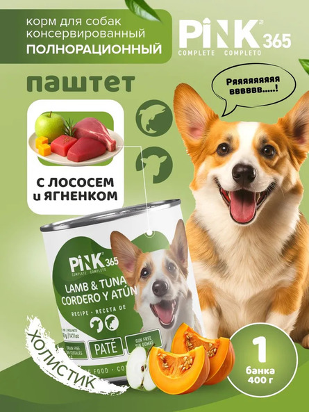 PINK 365 — натуральный Holistic-корм для собак всех пород и возрастов. Это полнорационные беззерновые консервы на основе ягнёнка (35%), тунца (30%) и тыквы, без курицы, без глютена, без усилителей вкуса и злаков.