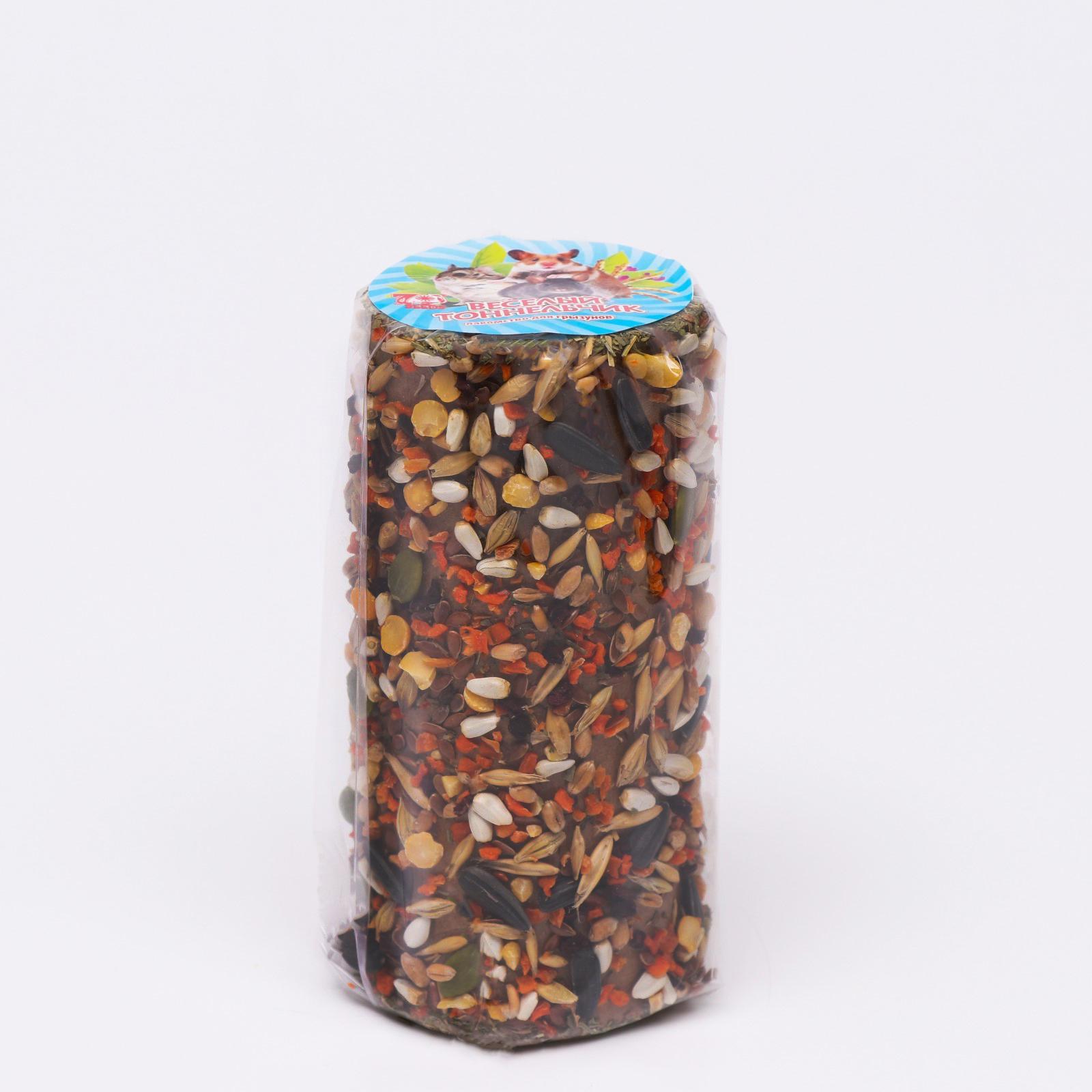 Лакомство для грызунов. Предназначено как дополнение к основному корму. Состав: овёс, пшеница, ячмень, подсолнечник, тыквенное семя, морковь, свёкла, сафлор, горох, красное просо, сено рубленое, картонный ролл.