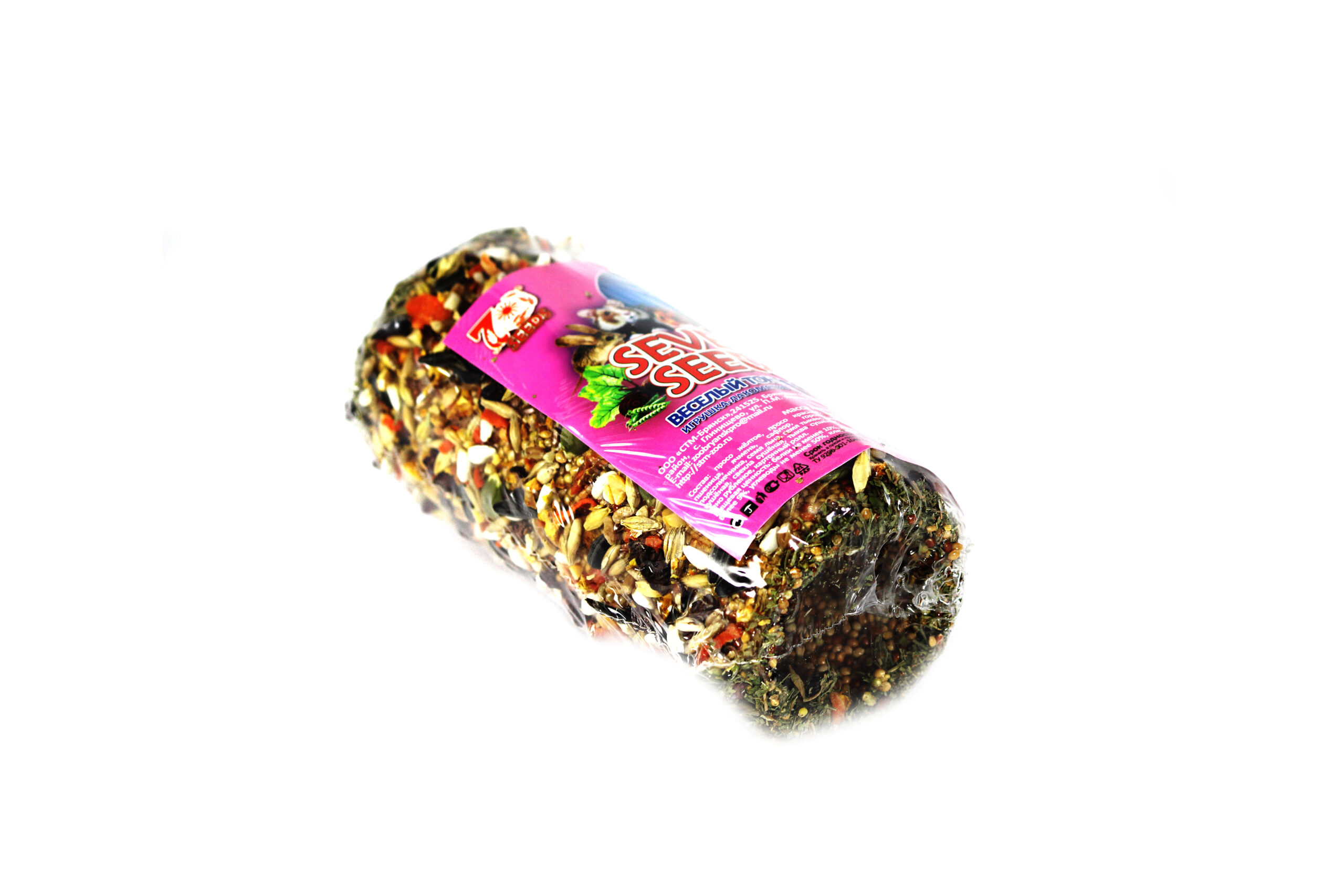 Лакомство для грызунов. Предназначено как дополнение к основному корму. Состав: овёс, пшеница, ячмень, подсолнечник, тыквенное семя, морковь, свёкла, сафлор, горох, красное просо, сено рубленое, картонный ролл.