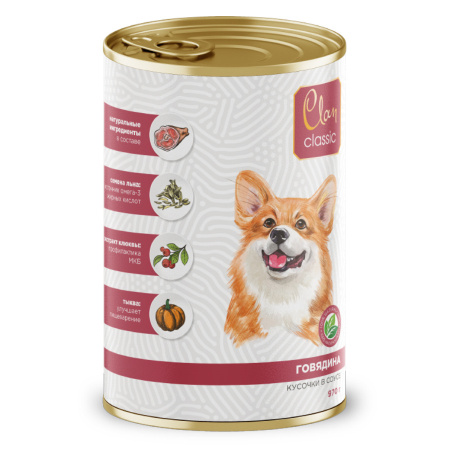 Функциональный консервированный влажный корм для собак Clan — это полноценное питание для вашего питомца. Нежные кусочки говядины в аппетитном соусе обеспечат здоровое витаминизированное питание, а вам подарят уверенность в надёжности продукта. Не содержит искусственных консервантов и ароматизаторов.